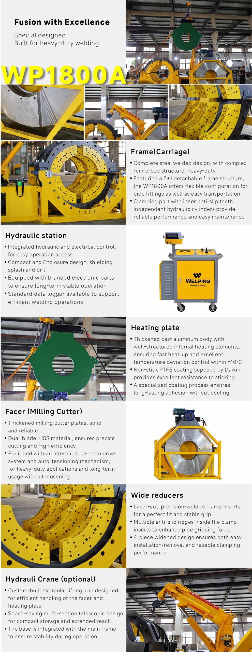 - The WP1800A butt fusion machine is a multi-purpose machine that has been specifically designed to weld pipes with diameters ranging from 1200mm to 1800mm. It is capable of butt fusion welding pipes and fittings of all pressure levels. This butt welding machine with high welding precision, ensures the quality of welded joints.