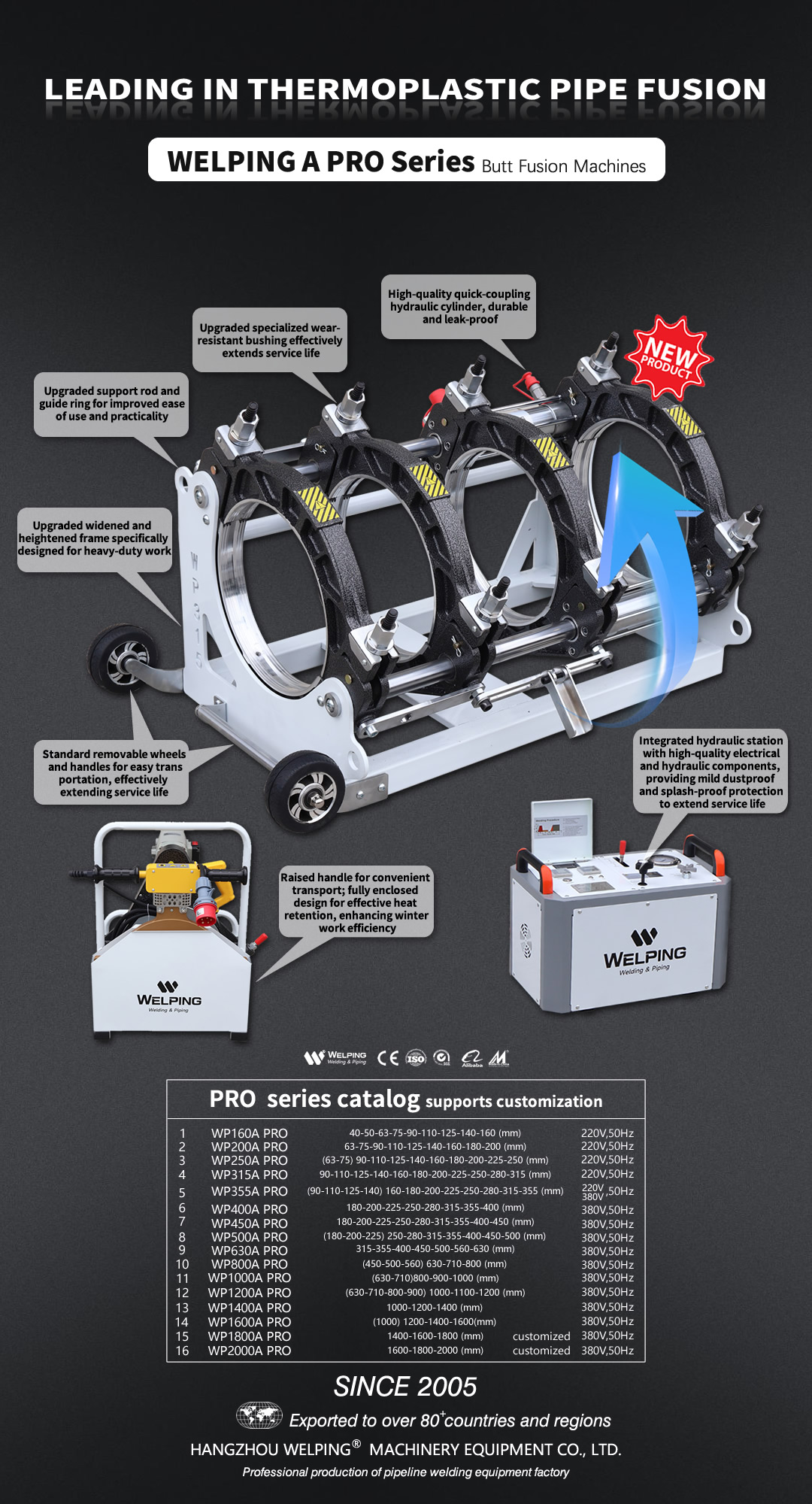 - The WP355A Pro butt fusion machine is a multi-purpose machine that has been specifically designed to weld pipes with diameters ranging from 160mm to 355mm. It is capable of butt fusion welding pipes and fittings of all pressure levels. This butt welding machine with high welding precision, ensures the quality of welded joints.